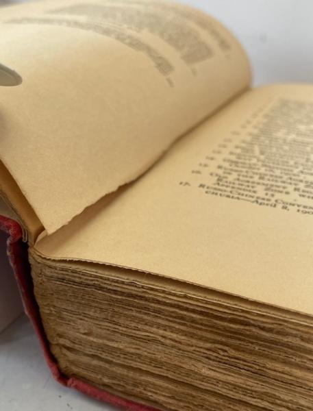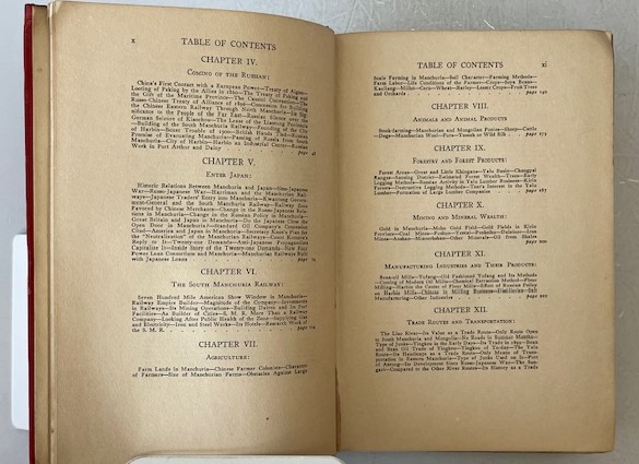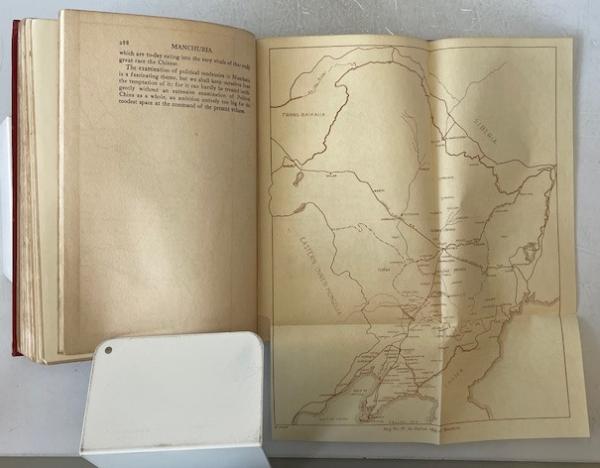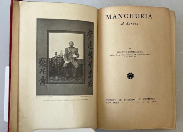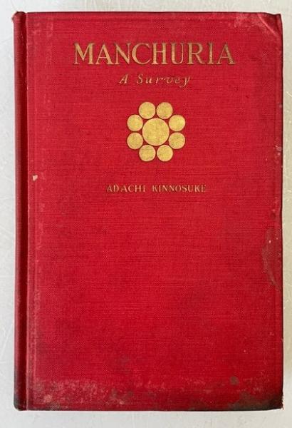 • 解説 A vintage1925 first edition of *Manchuria: A Survey by Adachi Kinnosuke, published in New York by Robert M. McBride & Company**, offering a detailed look at Manchuria’s geopolitical and economic state during the Warlord Era. Features a frontispiece portrait of Marshal Chang Tso-lin with his inscription, and chapters on the South Manchuria Railway, Russian and Japanese influence, agriculture, mining, and trade. Written for an American audience, highlighting Manchuria’s significance to Japan. **Condition: Acceptable / Fair**—red cloth cover stained with water discoloration, frayed spine ends; interior shows heavy foxing, but binding remains intact.