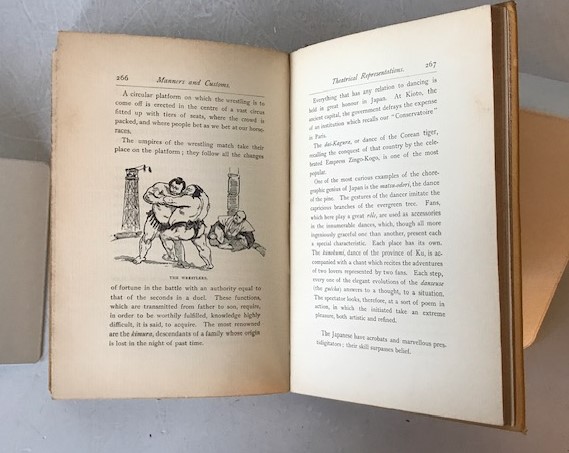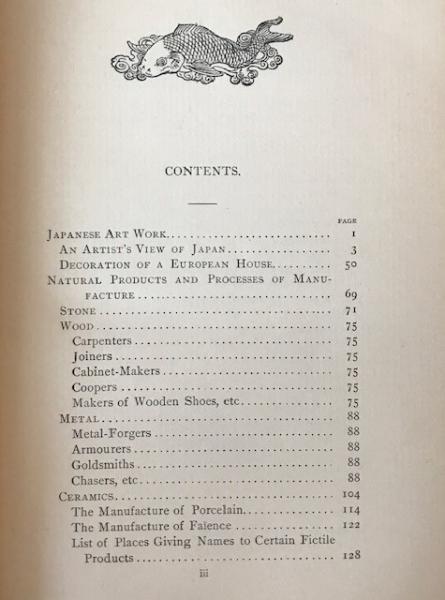 • 解説 A vintage 1893 edition of Japan in Art and Industry: With a Glance at Japanese Manners and Customs by French artist Félix Régamey, published by G. P. Putnam’s Sons, New York. Translated observations on Meiji-era Japan, focusing on art, craftsmanship, and daily life. Illustrated with “One Hundred Designs by the Author,” depicting artisans, architecture, and scenes such as sumo wrestling. Bound in original decorative cloth with Japanese motifs in silver/grey stamping. Condition: Good- / Fair soiled and darkened cloth with wear, age-toned but clean pages, and extensive handwritten notes on endpapers. A genuine example of late 19th-century Japonisme literature.