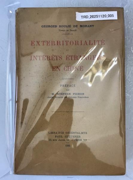 • 解説 A rare 1925 first edition of Exterritorialité et intérêts étrangers en Chine by Georges Soulié de Morant, published in Paris by **Paul Geuthner**. Written by a French Consul and renowned Sinologist (noted for introducing acupuncture to the West), this substantial 500+ page study analyzes extraterritoriality, foreign concessions, and legal status in 1920s China, with a preface by Stéphen Pichon, former Foreign Minister. Condition: Good (Vintage) original paper wrappers with age-toning, foxing, and a front sticker; interior age-toned with scattered foxing, untrimmed edges, and a sound but fragile binding. An essential primary source for scholars of colonialism, international law, and modern China.