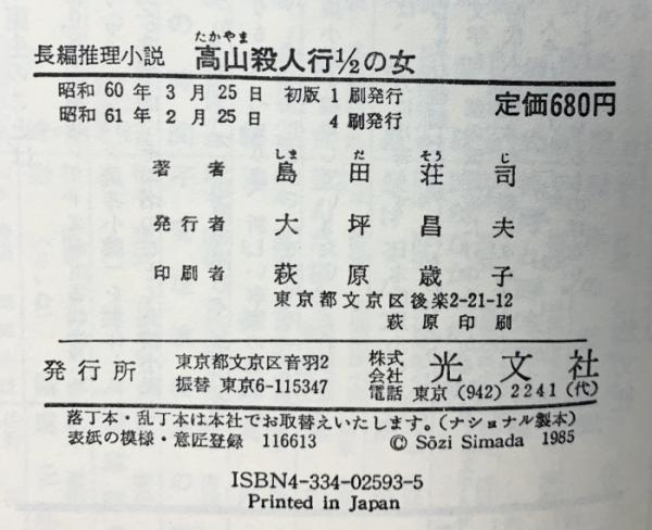 高山殺人行2分の1の女 (カッパ・ノベルス) 光文社 島田 荘司