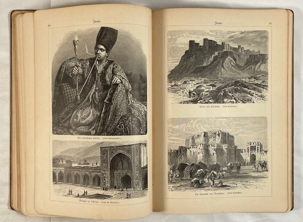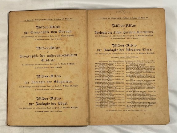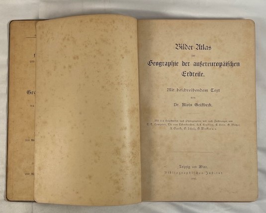• 解説 A vintage German pictorial atlas, Bilder-Atlas zur Geographie der aussereuropäischen Erdteile (c. 1897–1905), by Dr. Alois Geistbeck, published by Bibliographisches Institut, Leipzig and Vienna. Focused on non-European continents, it features 314 woodcut and engraved illustrations of landscapes, cities, indigenous peoples, and wildlife from Asia (including Japan), Africa, the Americas, Australia (Platypus, Emu), and the South Polar Regions, printed in German Fraktur. Original decorative grey cloth with Art Nouveau blocking. Condition: Grade C shelf wear, rubbed corners and spine ends, soiled exterior; interior pages yellowed but clean, binding sound. A valuable resource for historical geography and antique illustration collectors.