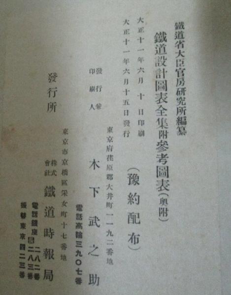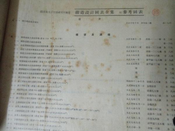 • 解説 (鐵道設計圖表全集 附參考圖表は目次・P7枚/1.橋梁及溝橋・P231枚/2.伏樋・P3枚/3.遂道・P2枚/4.停車場・P47枚/5.諸建物・P13枚/雑・P1枚(27×39cm))・(転轍轍叉明細図・P42図) が合本1冊に纏められています。函は痛んでいます。印あります。大正11年刊は希少本で貴重資料です。