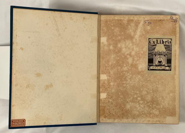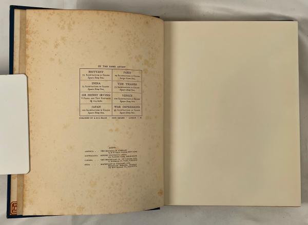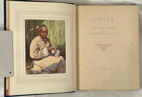 • 解説 A classic 1909 volume from A. & C. Black’s Menpes Crown Series, *CHINA* features Mortimer Menpes’ color plates and text by Sir Henry Arthur Blake, former Governor of Hong Kong. The original blue cloth binding has a striking gilt design of a Chinese Dragon chasing a pearl, with blind-stamped borders. Illustrations depict late Qing Dynasty life, street scenes, and portraits such as “A Shoemaker.” Provenance includes a vintage bookseller sticker from P.M. Bazendijk, Rotterdam, and an Art Nouveau Ex Libris of A.F.C. Phaff. Condition is GOOD to FAIR: firm binding with shelf wear, bright gilt, heavy foxing throughout, but pages are complete with no text markings.