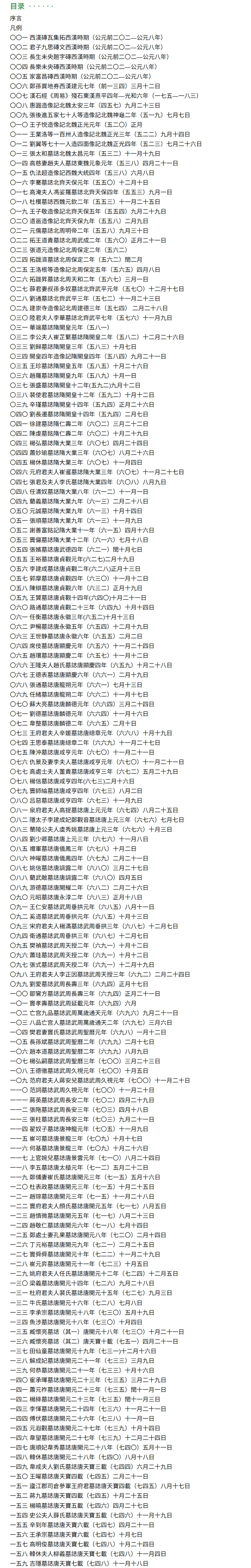 西南大学石刻研究中心が近年収蔵した、「張太和墓誌」「拓跋済墓誌」「楊休墓誌」「李建成墓誌」「長孫斌墓誌」など前漢から唐代までの石刻277通を時間順に収録。大半は私人所蔵家のもので多くが初公開である。各石刻は題名・提要・録文・注釈を記載。注釈は難解な漢字・語句、原刻の誤字・脱字・衍字、史伝に記載がない或いは記載があるが異なっている人物・事件・地理などに重点を置く。釈文巻、図版巻で構成。