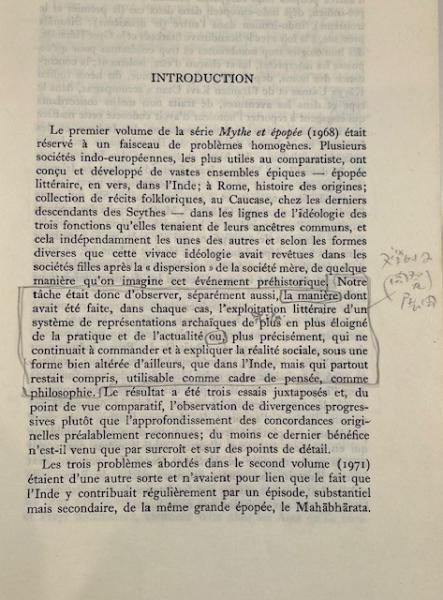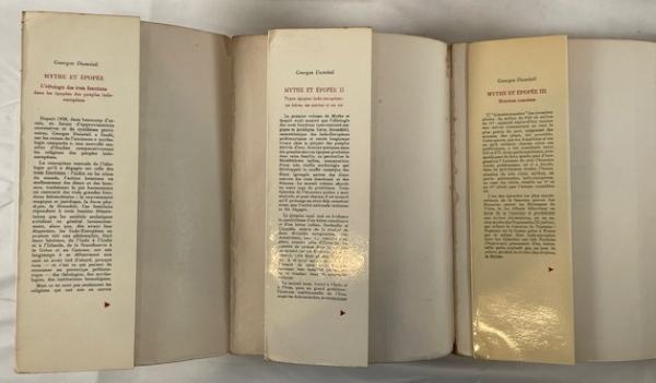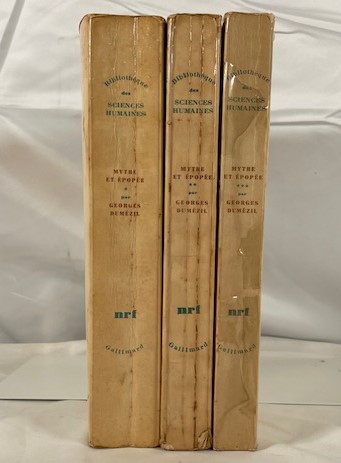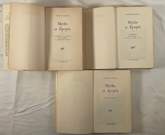 • 解説 This listing offers the complete three-volume set of Mythe et Épopée* by the eminent comparative mythologist Georges Dumézil, published by Gallimard in the respected *Bibliothèque des Sciences Humaines series. The set includes L’idéologie des trois fonctions, Types épiques indo-européens (colophon dated 1971), and *Histoires romaines*. Condition is ACCEPTABLE / POOR, sold strictly as a working or study copy. Interiors contain extensive ink and pencil annotations throughout, including marginal notes in Japanese (kanji and kana), suggesting prior scholarly use. Exteriors show heavy wear: creased and sun-browned spines, peeling laminate, and general shelf wear. Bindings remain intact. An important, affordable reference set for serious study.