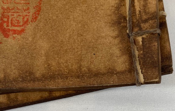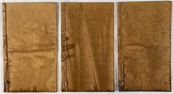 Thread-bound in the traditional style and lithographically printed in a woodblock manner, each volume measures about 19.5 × 13 cm. Condition is fair to poor, with heavy water staining and age browning throughout, though the stitching is intact and the text remains readable.