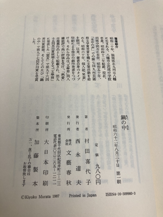 鍋の中 文藝春秋 村田 喜代子