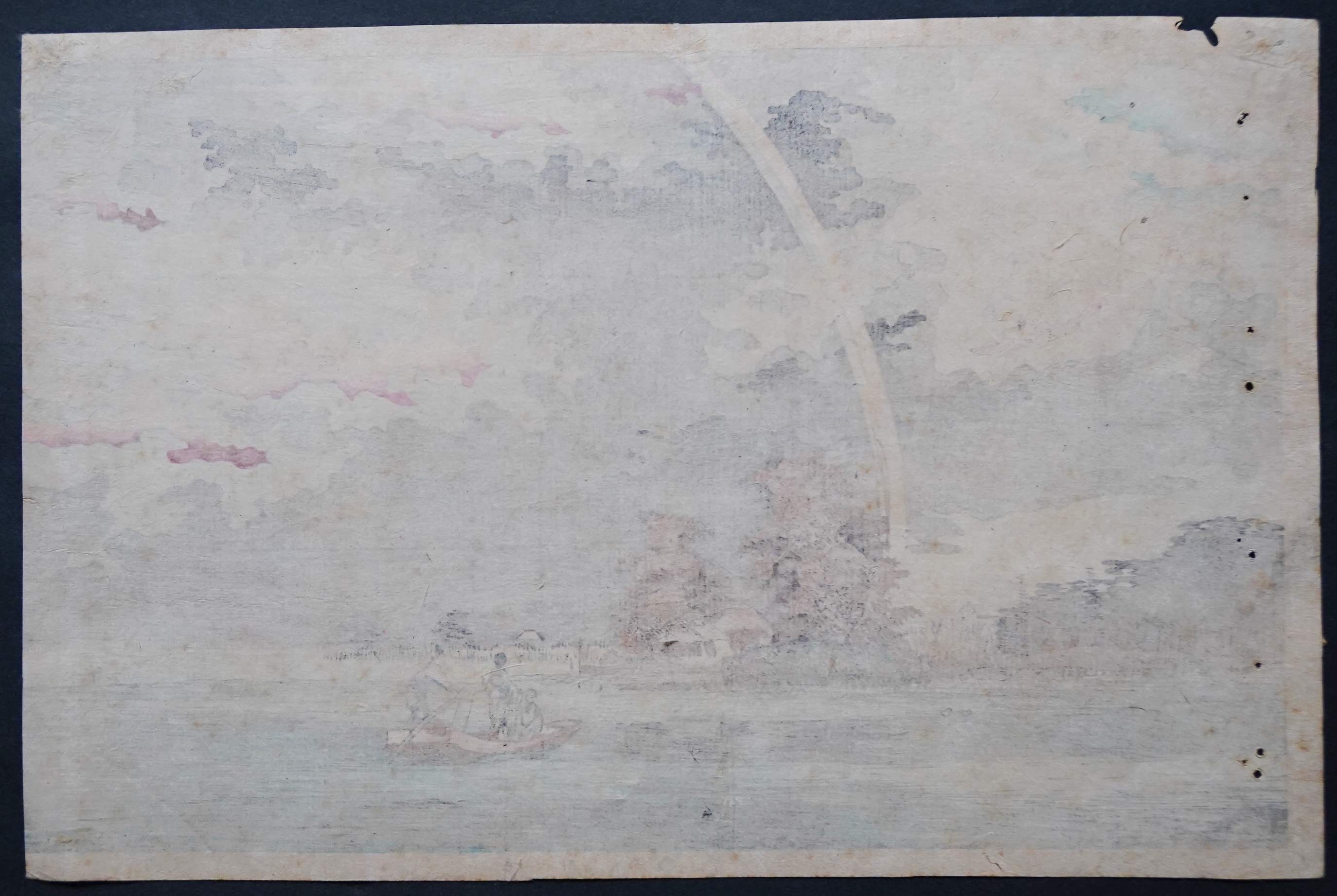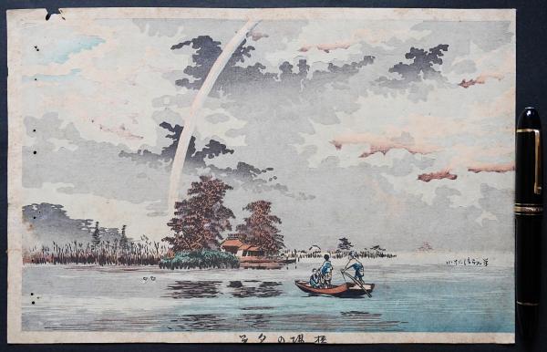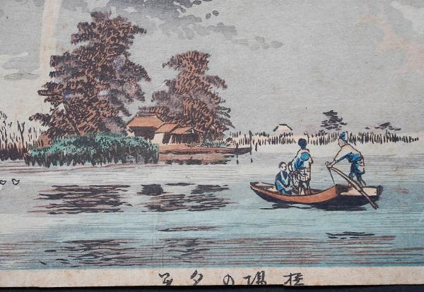 隅田川下流・橋場付近の夕暮れを描いた風景木版画。