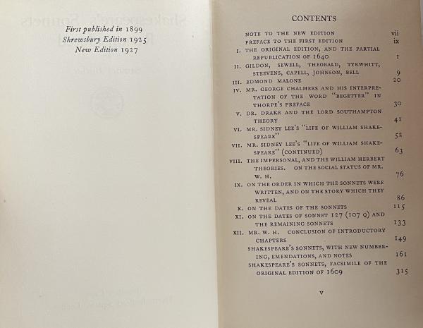 The main text extends to p. 315, followed by a facsimile of the title page of the original 1609 edition of Shakespeare's Sonnets. This is succeeded by a facsimile of the sonnets as originally printed, paginated to 154, concluding with Finis. The volume further includes a facsimile of A Lover’s Complaint, extending to a further 10 pages, also concluding with Finis.