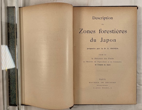 • 解説 Description des Zones forestières du Japon is a seminal work by Dr. Seiroku Honda (1866–1952), the “Father of Japanese Parks” and creator of the Meiji Jingu sacred forest. Published at the turn of the 20th century, it introduced Japan’s forestry science to the West, detailing vegetation zones, tree species, and forestry products of the Japanese Empire, including those exhibited at the 1900 Expo. Issued by the Direction des Forêts, Ministry of Agriculture and Commerce, and printed in Paris by Maurice de Brunoff, the book is in French. Condition is Good to Fair, with binding wear and notable foxing consistent with age.