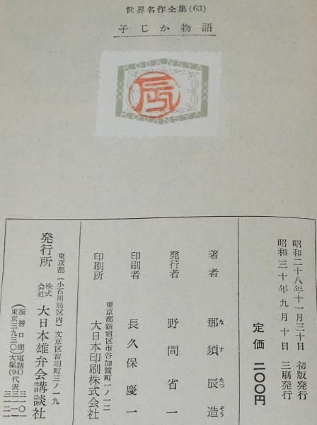 • 解説 世界名作全集63 那須辰造 子じか物語 大日本雄弁会講談社 昭和30年9月3刷 B6判ハードカバー箱入.