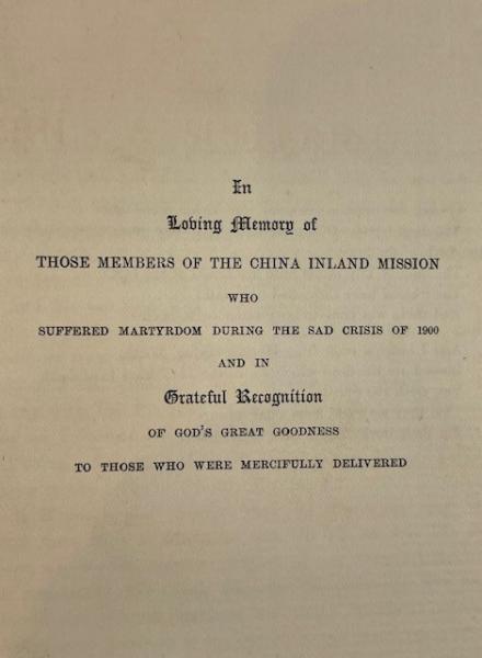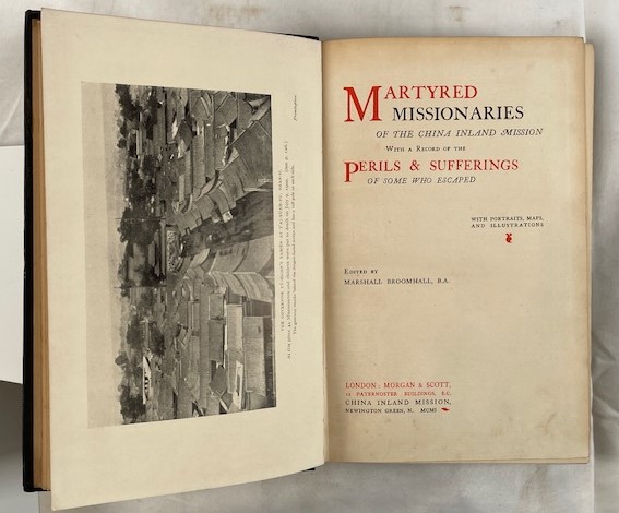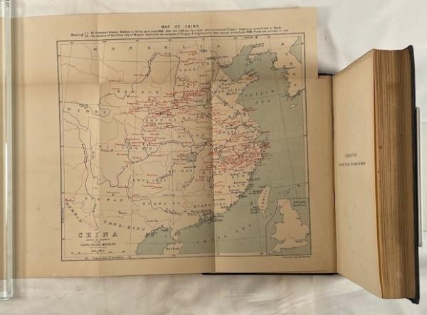 • 解説 This volume is a somber and historically important primary source on the Boxer Rebellion (1900) and the severe losses suffered by the China Inland Mission. This copy bears a handwritten Japanese inscription dated “Meiji 34” (1901), indicating acquisition in Japan shortly after publication and adding notable provenance. The book contains detailed biographies and firsthand accounts of missionaries’ hardships in Shansi, Honan, and other provinces, with numerous photographic portraits of martyred families. It includes two folding maps: a color route map of the Shansi and Honan missionaries and a large map of China. Bound in original dark cloth with gilt lettering and TEG, the condition is Fair to Good, with spine loss, edge wear, foxing, and age-related map creases.