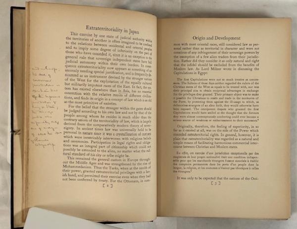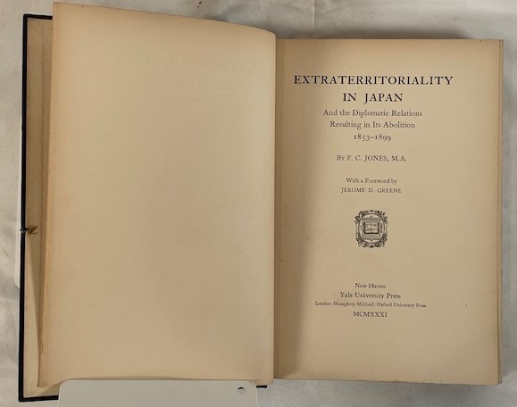 • 解説 This scholarly work examines Japan’s prolonged diplomatic effort to revise the “Unequal Treaties” and abolish Western-imposed consular jurisdiction. The copy bears the armorial bookplate of T. A. Walker Esq., LL.D., F.R.S.A., likely Thomas Alfred Walker (1862–1935), the noted historian of the Law of Nations and Fellow of Peterhouse, Cambridge, adding strong scholarly provenance. The foreword is by Jerome D. Greene, Chairman of the Townsend Harris Endowment and an important figure in early U.S.–Japan relations. Condition is Very Good with annotations: the original navy cloth binding is clean and tight with bright gilt lettering and minimal wear, while the interior shows age-toned endpapers and pencil annotations on the preface, introductory pages, and rear pastedown, likely by the former owner.