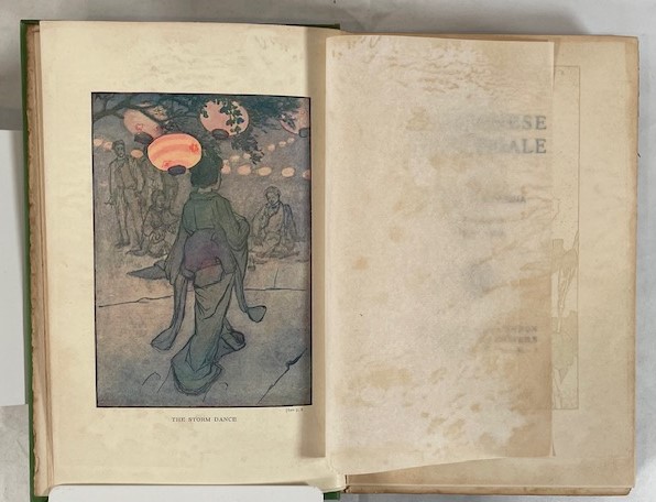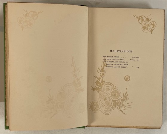• 解説 This volume is a prime example of turn of the century Japonisme and early Asian-American literature, lavishly illustrated by Japanese artist Genjiro Yeto. It features evocative color plates and delicate monochrome floral and scenic marginalia on every page, creating an artistic reading experience. The copyright page states “October, 1901,” marking it as a First Edition. Bound in original green cloth with gilt spine lettering and top edge gilt (TEG), the binding is sound but shows shelf wear, fraying at the spine ends, and a slightly tender hinge. Interior pages are age-toned with significant foxing on plates and tissue guards, though marginal decorations remain clear. Condition: Good to Fair.