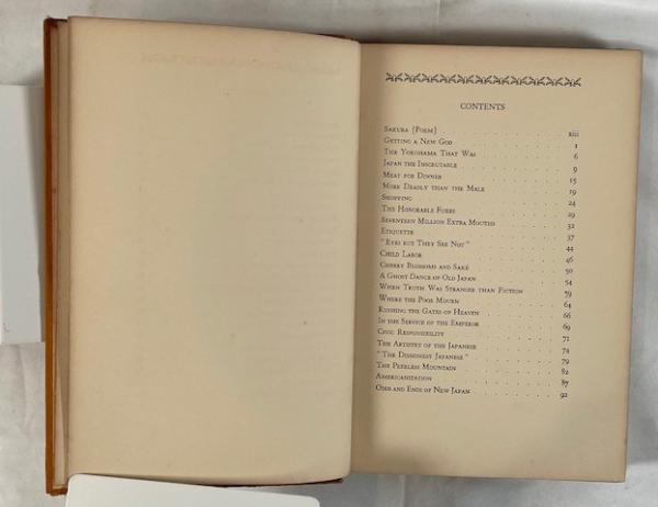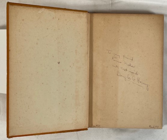 • 解説 A rare signed and inscribed First Edition of The Land of Gods and Earthquakes by anthropologist Douglas Gilbert Haring, published by Columbia University Press in 1929. The front flyleaf bears a contemporary inscription: “To my friend Fumio Nakao with best regards Douglas G. Haring,” and is numbered “Copy #35,” suggesting it was among the first personally distributed by Haring in Japan. The book is a collection of essays on Japanese culture, society, and customs during the early Showa period, covering topics such as The Yokohama That Was, Child Labor, and Cherry Blossoms and Sake, with photographic illustrations. Condition is Good/Very Good: original orange cloth binding shows shelf wear but is tight; pages are uniformly age-toned, text is clean, and the inscription remains bold.