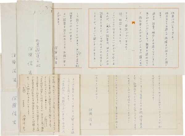 • 解説 井上康文宛 ペン書 昭35~48 献本礼状、また萩原朔太郎全集に際しての質問。「○あなたのどれかの詩集出版記念会に当り、萩原さんは発起人または幹事になりましたでしようか。○萩原さんの手紙、ハガキおもちでしようか。○詩人協会の『詩人年鑑』は第二集出たのでしようか。○あなたの主宰された雑誌に萩原さんは何かかいたことありましようか」(昭35・9・9)「『日本現代名詩集』は所持してますが、あの中の一篇(眺望する)は雑誌などに発表しない初出のもので、私共には一発見でした」(昭35・10・5)(発信地)荻窪(受信地)中通町 #八木書店近代自筆物/2.書簡類 #94号近代文学特輯 code07244 ※自筆物につきましては、毎月25日前後に新蒐品を追加しております。PDF形式で御覧になりたい方は https://company.books-yagi.co.jp/archives/news/10928 を参照ください。