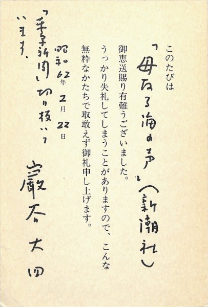 • 解説 青山光二宛 印刷・ペン書 昭62・2・23(消印) 「母なる海の声」献本礼状。(発信地)杉並区上荻(受信地)狛江市 #八木書店近代自筆物/3.葉書類 #八木古書2025年6月新蒐 code09707 ※自筆物につきましては、毎月25日前後に新蒐品を追加しております。PDF形式で御覧になりたい方は https://company.books-yagi.co.jp/archives/news/10928 を参照ください。94号目録(R7.1)以後の追加は「#八木古書2025」で検索できます。