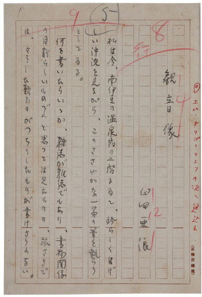 • 解説 『観音像』 ペン書 200字詰原稿用紙12枚完 冊子仕立 地の底から掘り出された観音像を、高村光雲が国宝級だと褒めてしまい、やがては参拝者まで現れて……。作者いわく「取って置きの現代風景の一つ」。(種別)随筆 #八木書店近代自筆物/1.草稿類 #94号近代文学特輯 code04205 ※自筆物につきましては、毎月25日前後に新蒐品を追加しております。PDF形式で御覧になりたい方は https://company.books-yagi.co.jp/archives/news/10928 を参照ください。