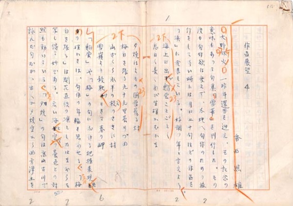 • 解説 『作品展望4』 ペン書 400字詰原稿用紙34枚完 昭和41年の俳人評。扱われているのは大野林火、石原八束、高浜年尾、上村占魚、石田波郷、石塚友二など計24名。(種別)評論 #八木書店近代自筆物/1.草稿類 #94号近代文学特輯 code04189 ※自筆物につきましては、毎月25日前後に新蒐品を追加しております。PDF形式で御覧になりたい方は https://company.books-yagi.co.jp/archives/news/10928 を参照ください。