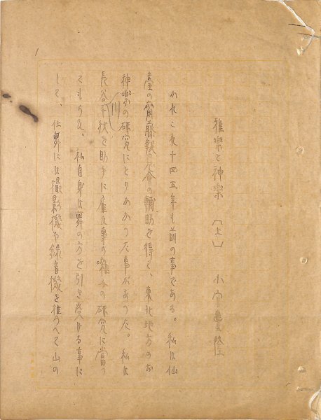 • 解説 『雅楽と神楽』上下 ペン書 200字詰原稿用紙11枚完 雅楽と神楽の研究を始めたものの戦争で中断。文末に「二二・五・三」とある。(種別)随筆 #八木書店近代自筆物/1.草稿類 #八木古書2025年2月新蒐 code09433 ※自筆物につきましては、毎月25日前後に新蒐品を追加しております。PDF形式で御覧になりたい方は https://company.books-yagi.co.jp/archives/news/10928 を参照ください。94号目録(R7.1)以後の追加は「#八木古書2025」で検索できます。