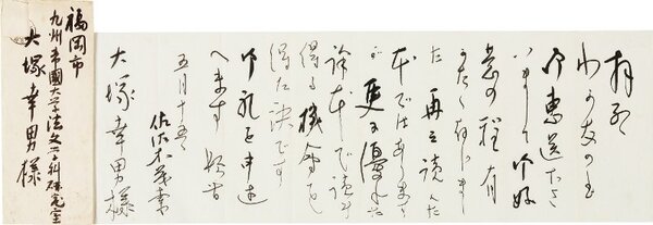 • 解説 大塚幸男宛 毛筆 巻紙17行 封筒付 昭9・5・15(本文) 切手切取 住所印 アナトール・フランスの「わが友の記」を送られたことへの礼状。「再々読んだ本ではありますが更に優れた譯本で読み得る機会を得た訳です」。(発信地)麹町文芸春秋社(受信地)福岡市九州帝大 #八木書店近代自筆物/2.書簡類 #94号近代文学特輯 code00961 ※自筆物につきましては、毎月25日前後に新蒐品を追加しております。PDF形式で御覧になりたい方は https://company.books-yagi.co.jp/archives/news/10928 を参照ください。