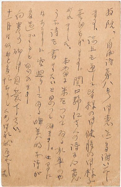 • 解説 井上康文宛 ペン書 9行 昭25・12・3(消印) 「自由詩八号」の献本礼状。「関口静江さんの詩に心惹かれました。本當に米をついてゐる水車のやうな詩を書きたいと思つてゐます。世間にはあまりに空廻りしてゐる唯美的な詩が多過ぎると思ひます」。(発信地)千葉県東浪見村(受信地)自由詩社 #八木書店近代自筆物/3.葉書類 #94号近代文学特輯 code06996 ※自筆物につきましては、毎月25日前後に新蒐品を追加しております。PDF形式で御覧になりたい方は https://company.books-yagi.co.jp/archives/news/10928 を参照ください。