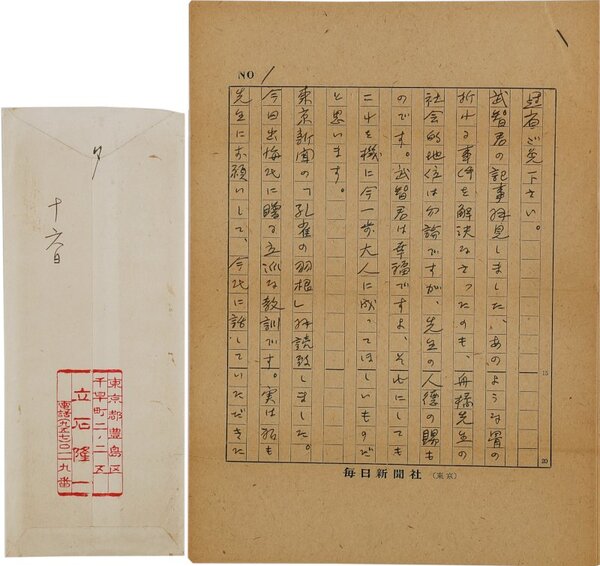 • 解説 舟橋聖一宛 ペン書 原稿用紙5枚50行 封筒付 昭43・6・17(消印) 「芸術祭審査委員」のこと。「今年度も既に審査員は決定しているようですが、二十年の間ワイロお車代の金銭を受取りつづけている審査員(舞踏の場合は全員)を絶対に止めさせるべきではないでしょうか」。(発信地)豊島区千早町(受信地)新宿区下落合 #八木書店近代自筆物/2.書簡類 code09821 ※自筆物につきましては、毎月25日前後に新蒐品を追加しております。PDF形式で御覧になりたい方は https://company.books-yagi.co.jp/archives/news/10928 を参照ください。94号目録(R7.1)以後の追加は「#八木古書2025」で検索できます。