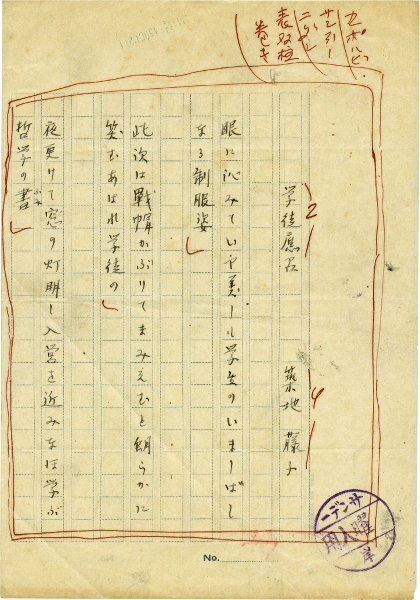 • 解説 『学徒應召す』 ペン書 400字詰原稿用紙1枚完 3首 「眼に沁みていや美しも学生のいましばしなる制服姿」他。(種別)短歌 #八木書店近代自筆物/1.草稿類 #94号近代文学特輯 code07229 ※自筆物につきましては、毎月25日前後に新蒐品を追加しております。PDF形式で御覧になりたい方は https://company.books-yagi.co.jp/archives/news/10928 を参照ください。