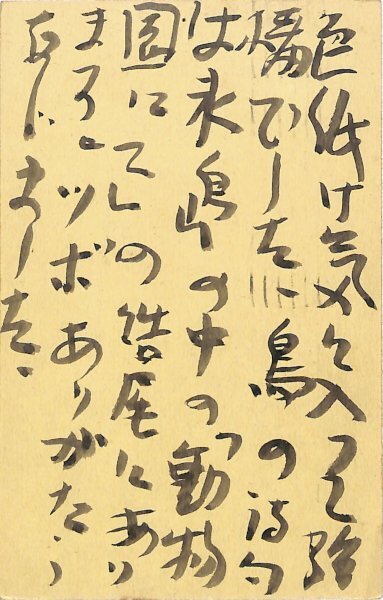 • 解説 竹村俊郎宛 毛筆 6行 昭10・5・1(消印) 色紙の補足か。「色紙御気に入って結構でした。鳥の詩句は氷島の中の『動物園にて』の結尾にあります」。(受信地)大森区馬込町東 #八木書店近代自筆物/3.葉書類 #94号近代文学特輯 code09240 ※自筆物につきましては、毎月25日前後に新蒐品を追加しております。PDF形式で御覧になりたい方は https://company.books-yagi.co.jp/archives/news/10928 を参照ください。