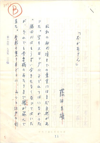• 解説 『「おかあさん」』 ペン書 200字詰原稿用紙9枚完 サトウ・ハチローの「おかあさん」についての書評。「若い女性」九月号掲載。(種別)書評 #八木書店近代自筆物/1.草稿類 #94号近代文学特輯 code07829 ※自筆物につきましては、毎月25日前後に新蒐品を追加しております。PDF形式で御覧になりたい方は https://company.books-yagi.co.jp/archives/news/10928 を参照ください。