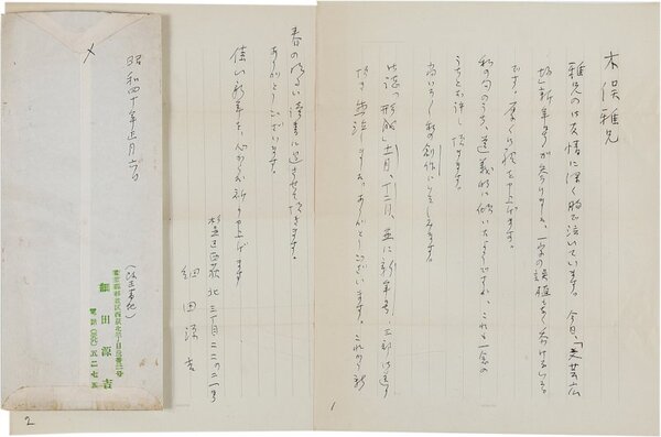• 解説 木俣修宛 ペン書 便箋2枚14行 封筒付 昭40・1・6(消印) 掲載誌礼状。「雅兄の御友情に深く胸で泣いています。今日、「文芸広場」新年号が参りました。一字の誤植もなく忝けないことです。厚く御禮申上げます」。(発信地)杉並区西荻北(受信地)杉並区上高井戸 #八木書店近代自筆物/2.書簡類 #八木古書2025年9月新蒐 code09857 ※自筆物につきましては、毎月25日前後に新蒐品を追加しております。PDF形式で御覧になりたい方は https://company.books-yagi.co.jp/archives/news/10928 を参照ください。94号目録(R7.1)以後の追加は「#八木古書2025」で検索できます。
