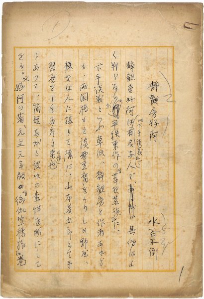 • 解説 『静観房好阿』 ペン書 200字詰原稿用紙10枚完 用紙劣化 江戸時代中期の戯作者、「静観房好阿」について。(種別)解説 #八木書店近代自筆物/1.草稿類 #94号近代文学特輯 code05641 ※自筆物につきましては、毎月25日前後に新蒐品を追加しております。PDF形式で御覧になりたい方は https://company.books-yagi.co.jp/archives/news/10928 を参照ください。