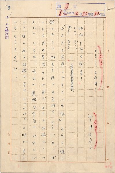 • 解説 『ようこそお正月!』 ペン書 200字詰原稿用紙7枚完 恐らくは「オール女性」昭10年1月号掲載。ある種の正月賛歌。(種別)随筆 #八木書店近代自筆物/1.草稿類 #八木古書2025年1月新蒐 code09432 ※自筆物につきましては、毎月25日前後に新蒐品を追加しております。PDF形式で御覧になりたい方は https://company.books-yagi.co.jp/archives/news/10928 を参照ください。94号目録(R7.1)以後の追加は「#八木古書2025」で検索できます。