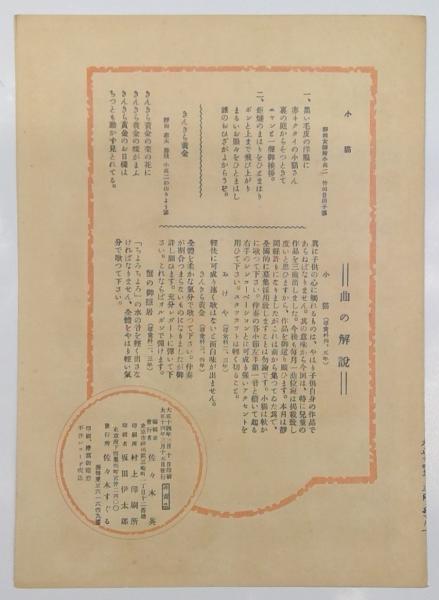 青い鳥楽譜 第十一篇 「小猫 竹田日出子:謡、佐々木すぐる:曲」、 「きんきら黄金 杉山きよう:謡、佐々木すぐる:曲」 佐々木英:編輯兼発行 非売品