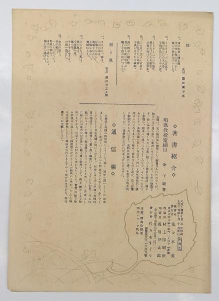 青い鳥楽譜 第26篇 「狸 銀田美之助:謡、佐々木すぐる:曲」、 「雨と風 遊佐康平:謡、佐々木すぐる:曲」 佐々木英:編輯兼発行 武井武雄:装丁 非売品