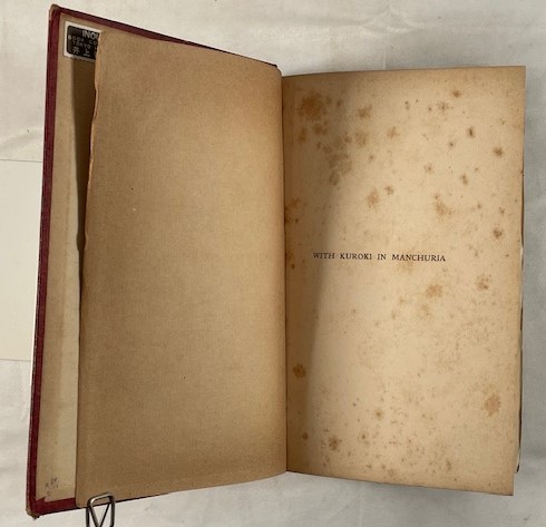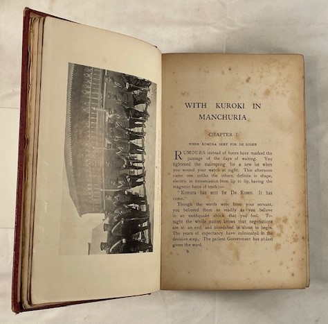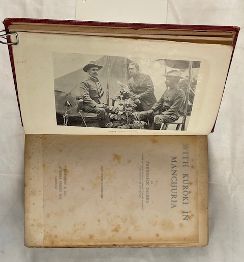 • 解説 A scarce firsthand account of the Russo-Japanese War (1904–1905) by American war correspondent Frederick Palmer, who was attached to the Japanese First Army under General Kuroki Tamemoto. Palmer witnessed key engagements including the Yalu River crossing and the Battle of Liaoyang, offering a valuable Western perspective on the modernization and discipline of the Imperial Japanese Army. Illustrated with numerous contemporary black-and-white photographs from the front lines. Condition is acceptable to fair only: original red cloth with gilt lettering shows heavy sunning, wear, and chipping; the front hinge is cracked but pages remain attached. Interior shows heavy foxing and age-toning. Approx. 23 cm tall.
