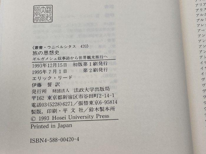 旅の思想史 エリック・リード著 叢書ウニベルシタス 420 法政大学出版局
