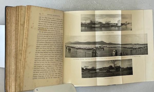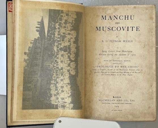 • 解説 First Edition (1904) of Manchu and Muscovite by B. L. Putnam Weale, published by Macmillan & Co., London, subtitled Being Letters from Manchuria Written during the Autumn of 1903*. This firsthand account details Russian occupation of Manchuria prior to the Russo-Japanese War, covering administration, military presence, and the approaching conflict. Features a large fold-out map of Manchuria and numerous photographs. Provenance includes a Kelly & Walsh, Ltd., Yokohama bookseller ticket and a Japanese pencil inscription. Condition: original blue cloth fair with staining, frayed spine ends, and bumped corners; rear hinge cracked but holding; interior good, text age-toned but clean, map in good condition. A key primary source on East Asian geopolitics.