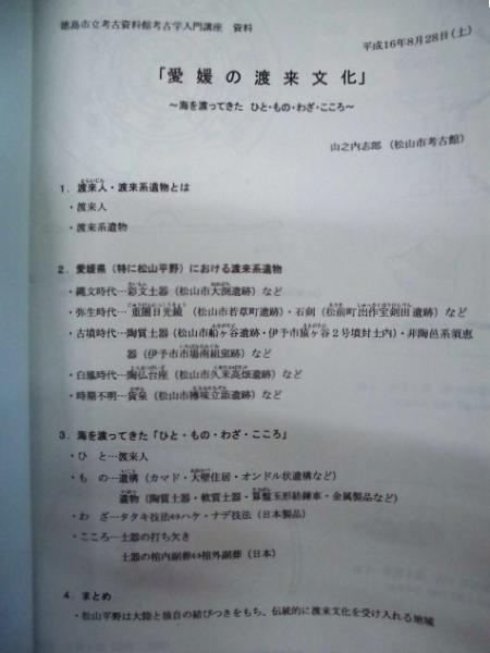 • 解説 平成16年度 徳島市立考古資料館 考古学入門講座第4回 愛媛の渡来文化 ~海を渡ってきた ひと・もの・わざ・こころ~ 2004.8.28、徳島市立考古資料館 本体のみの薄い冊子、A3判5ページ 全体を2つ折りにしてあります。