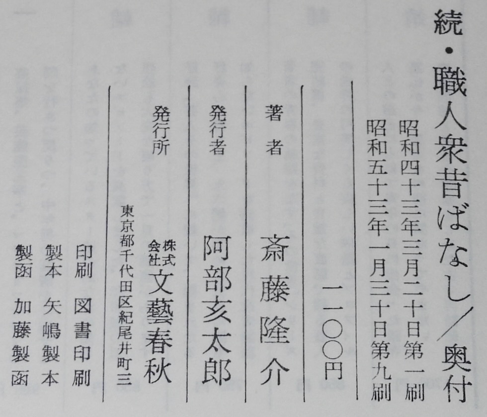 • 解説 続 職人衆昔ばなし 斎藤隆介 文藝春秋 昭和53年1月第9刷 四六判ハードカバー箱帯付.