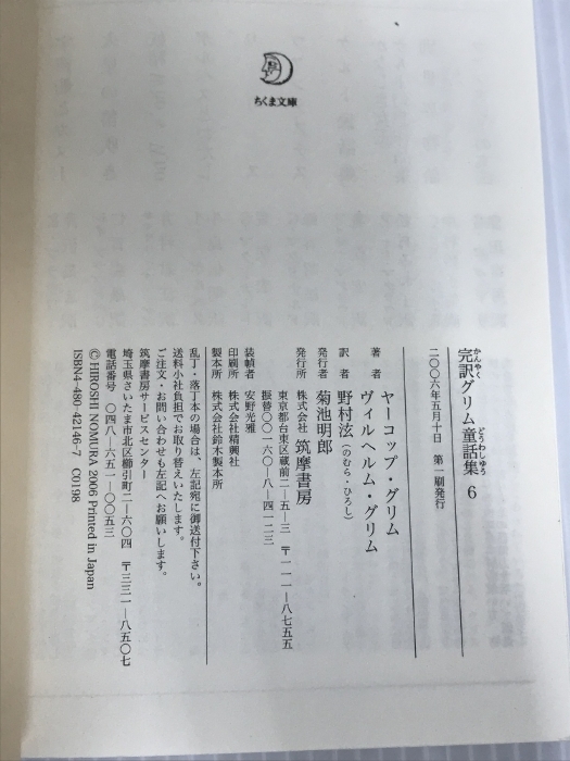 ※カバーなし。完訳グリム童話集 6 (ちくま文庫 く 5-8) 筑摩書房 ヤーコップ グリム