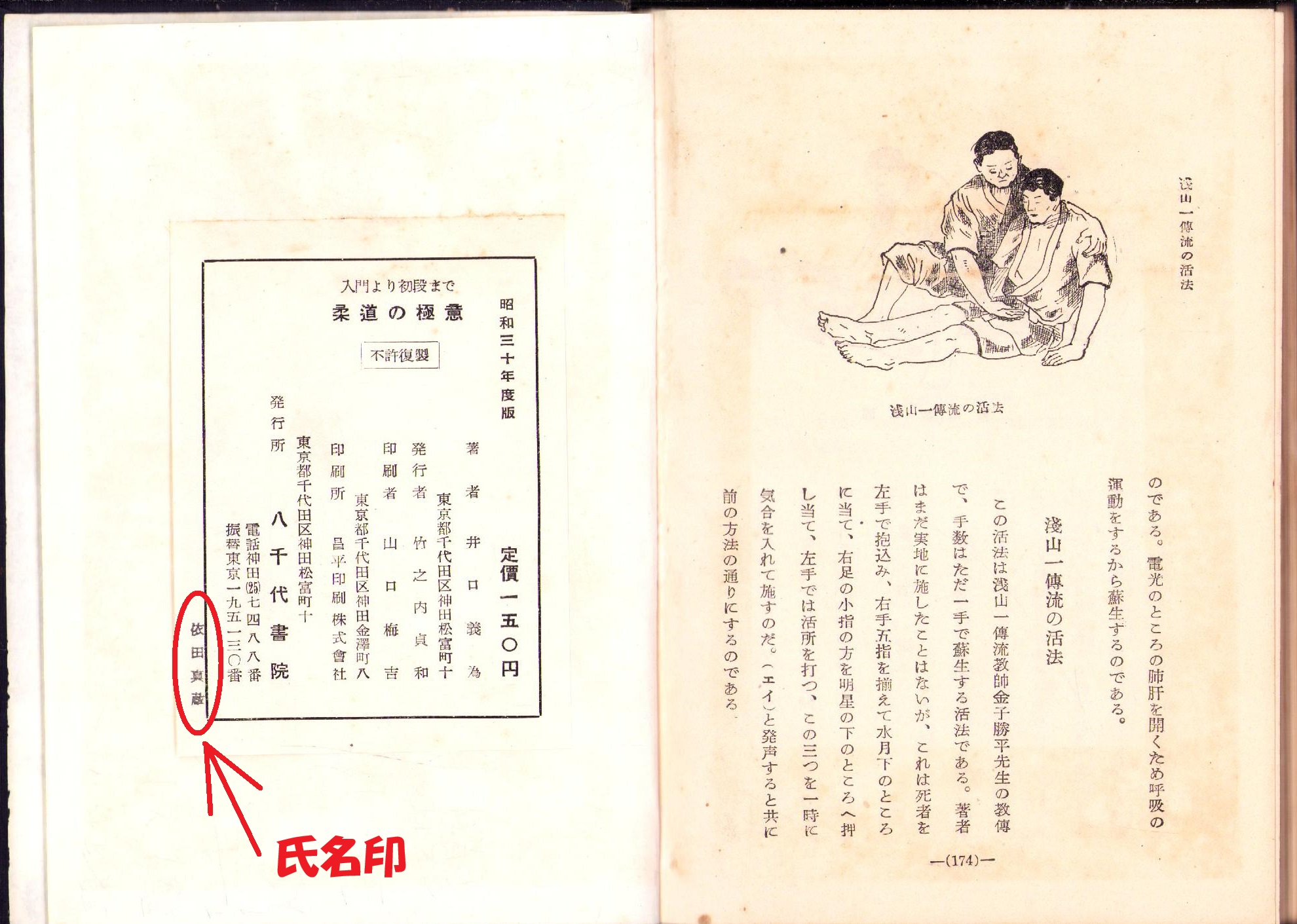 • 解説 174頁、裸本、〈奥付書名「入門より初段まで 柔道の極意」〉、奥付に氏名印、天と小口に経年しみ