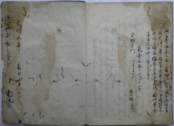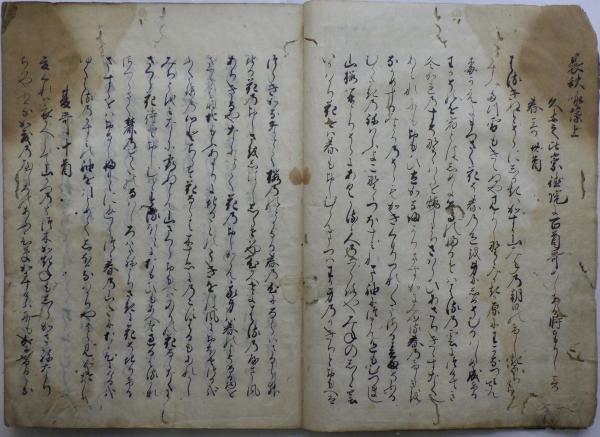 • 解説 縹色表紙、27.2×20.6㎝。書写奥書「文明九年春日書写之」、取得奥書「弘化三〈丙午〉閏五月求之。尤古本也」。水浸み・少虫損。