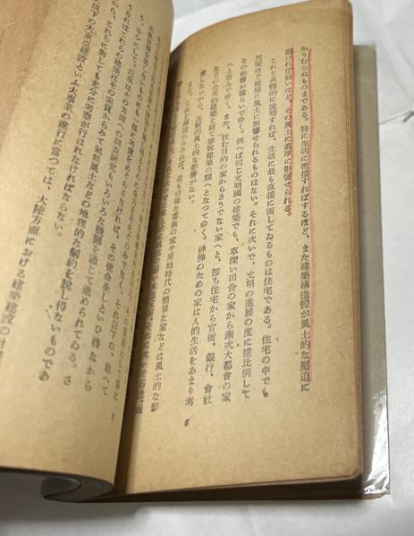 • 解説 東京中央放送局での物語支那文化史の一部として、連続5回にわたっての講演「支那建築」を敷衍補足したもの p5〜p6の3行に赤鉛筆ライン 経年ヤケ カバー(表表紙に赤鉛筆で書き込み傷、裏表紙に三文判印、傷み、透明カバー掛け)付 154頁 地勢と気候、材料・構造と風土的表現、民族の建築表現、新支那建築の現在と将来 附:支那文化とその保存 新書判 昭和17年刊