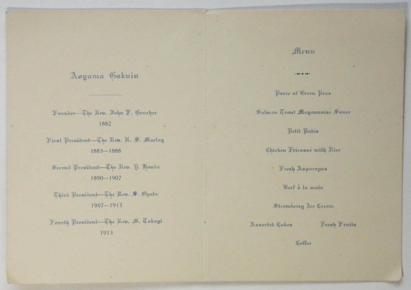 〈英文〉青山学院同窓会 高木(壬太郎)院長就任祝賀会献立 1913