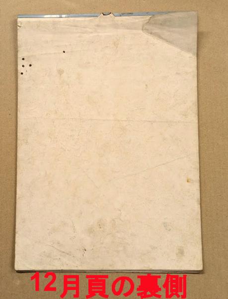 状態D(経年傷み・ヤケ・シミ・汚れ。最終の12月頁に破れ・少欠損・強め傷み、表紙に目立つシミ・多数シワ・小破れ、全体に角折れ・めくりジワ、フチや裏にシミ汚れ、金具に錆び・少反り有り。)