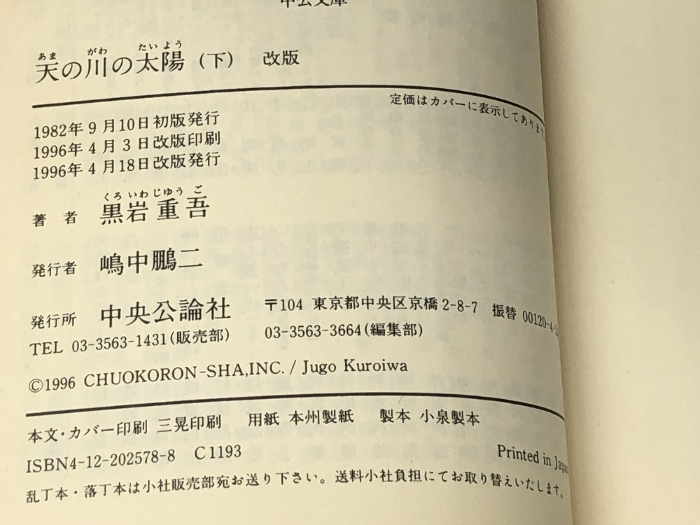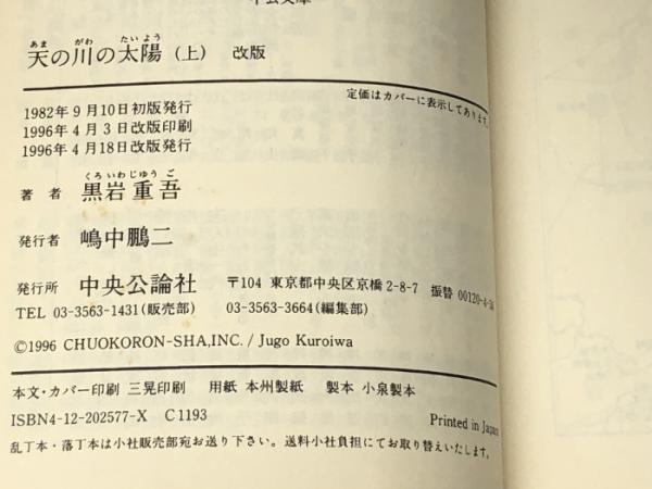 天の川の太陽〈上・下〉(中公文庫) 中央公論社 黒岩 重吾※イタミ有