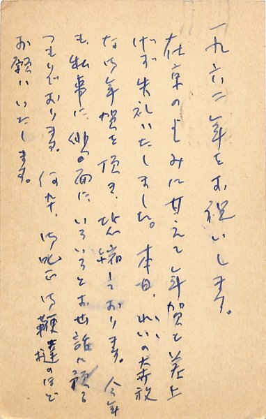 • 解説 橋本夢道宛 ペン書 7行 昭37・1・11(消印) 年賀状が遅れたことの詫び。「在京のよしみに甘え年賀も差上げず失礼致しました。本日、れいの奔放な御年賀を頂き、恐縮しております。今年も私事に、俳句面に、いろいろと御世話に預るつもりでおります。何卆、御叱正御鞭撻のほどお願いいたします」。 #八木書店近代自筆物/3.葉書類 #94号近代文学特輯 code09406 ※自筆物につきましては、毎月25日前後に新蒐品を追加しております。PDF形式で御覧になりたい方は https://company.books-yagi.co.jp/archives/news/10928 を参照ください。