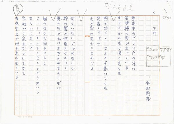 • 解説 『少年』 ペン書 400字詰原稿用紙4枚完 「日本未来派」(200号)掲載。(種別)現代詩 #八木書店近代自筆物/1.草稿類 #94号近代文学特輯 code08691 ※自筆物につきましては、毎月25日前後に新蒐品を追加しております。PDF形式で御覧になりたい方は https://company.books-yagi.co.jp/archives/news/10928 を参照ください。