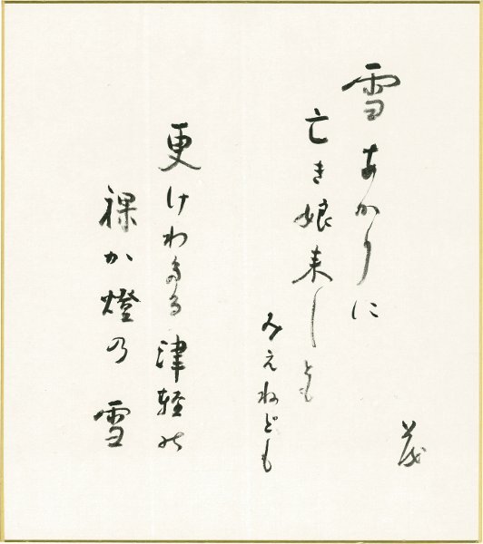 • 解説 雪あかりに亡き娘来しともみえねども更けわたる津軽の裸か燈の雪 茂 #八木書店近代自筆物/5.色紙類 #94号近代文学特輯 code07156 ※自筆物につきましては、毎月25日前後に新蒐品を追加しております。PDF形式で御覧になりたい方は https://company.books-yagi.co.jp/archives/news/10928 を参照ください。